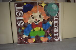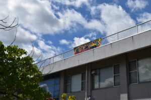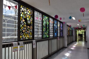 カラフルな教室の展示発表の準備 力を合わせて大パネルの吊り上げ