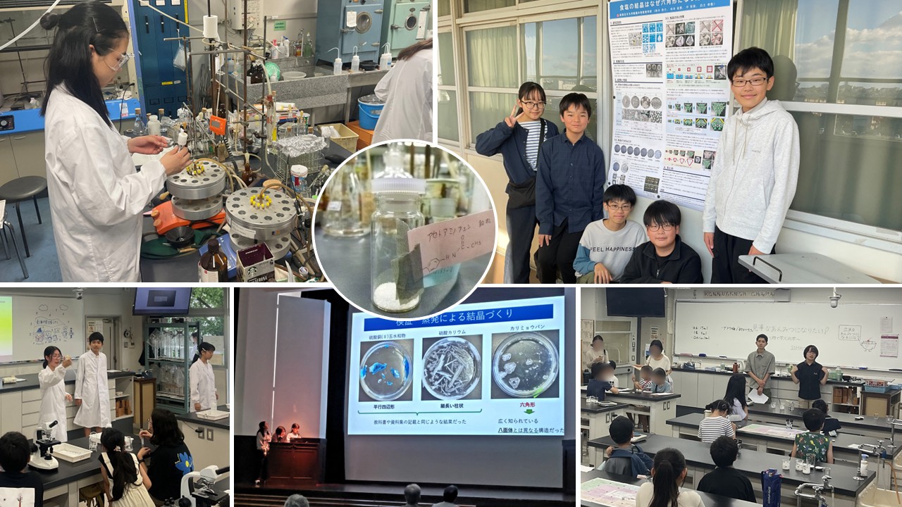大気測定、結晶づくり、炎色反応、有機合成など多様な課題設定のもと研究活動を行っています。主に化学教室を活動場所としていますが、一部の専門的な研究に関しては、大学の研究室を訪問して専門家の先生に直接ご指導をいただいています。