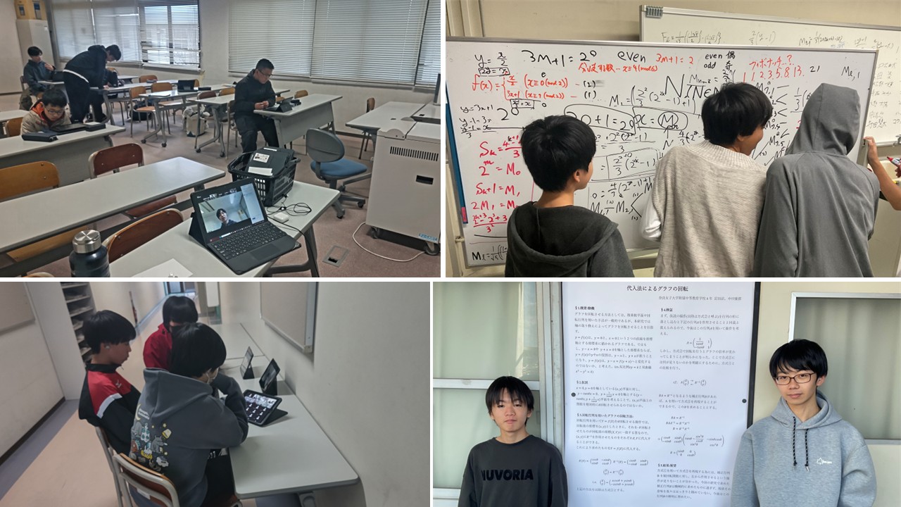 確率分野に関するテーマから、代数分野、解析分野、幾何分野まで幅広いテーマを個々に設定して研究活動を行ってます。数学班の活動場所では、ホワイトボードにたくさんの数式が書かれているのが特徴的です。名古屋大学教育学部附属中・高等学校とオンラインにて交流を図り、互いの研究活動に刺激を与えています。